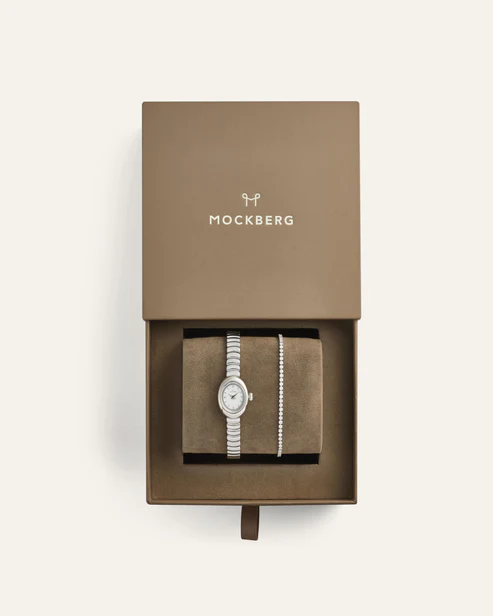 Mockbergs gåvoset med Belle Oval Petite-klocka och armband ger en klassisk, sammanhållen look som passar både vardag och fest. Kombinationen är lätt att bära och lyfter din stil utan att ta över. Klockan och armbandet levereras tillsammans i en presentask.