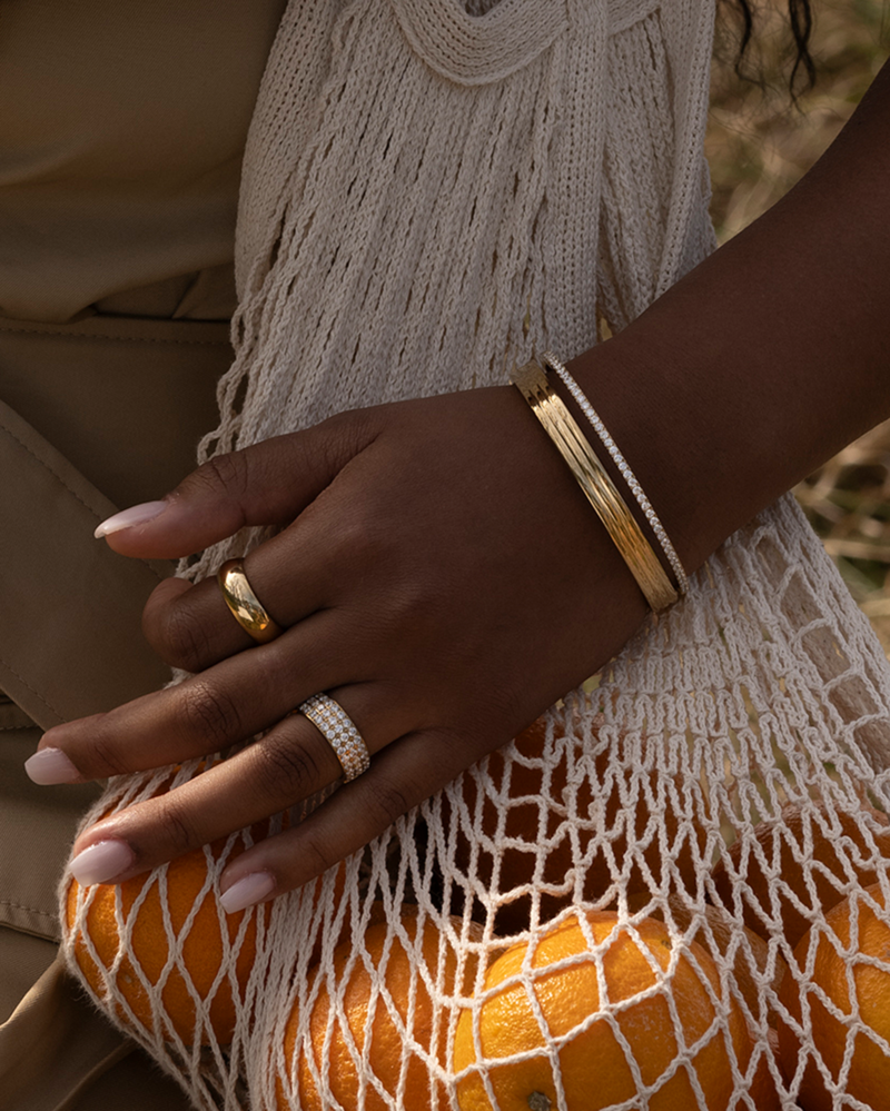 Denna armring av guldpläterat stål är definitonen av ’tidlös elegans’ med sin enkla rad av gnistrande kristaller.