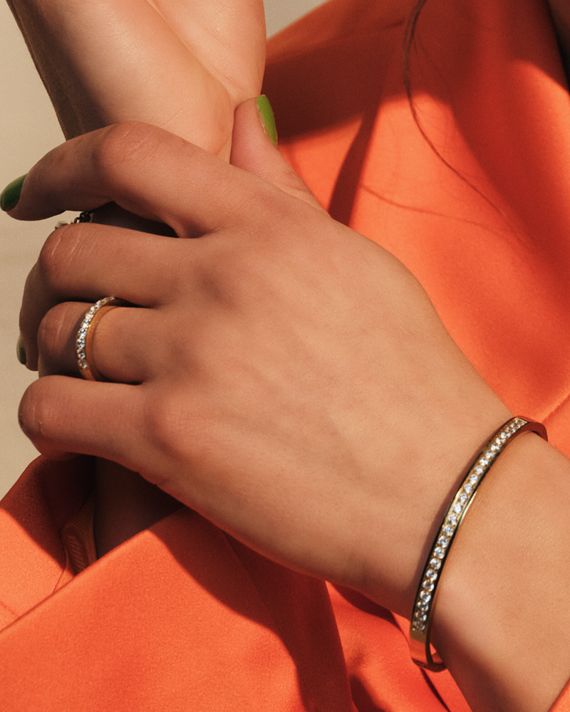 Addera en touch av briljans till din smyckesgarderob med denna armring. Detta vackra smycke är tillverkat av guldpläterat stål och pryds av en enkel rad gnistrande kristaller.