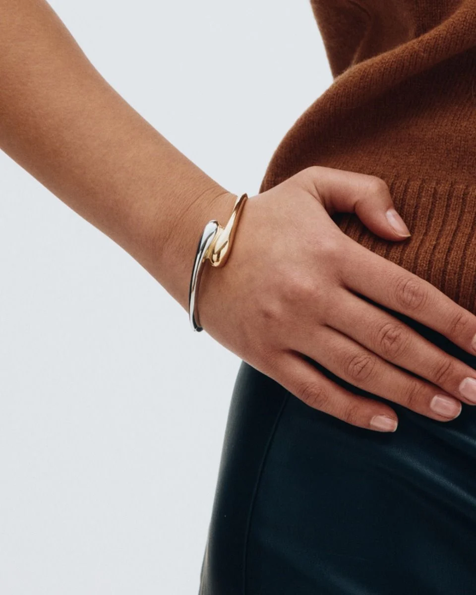 En tidlös droppform i mixade metaller som möts i perfekt harmoni utgör grunden för Harmony. Seriens iögonfallande bangle blandar 14K guldplätering och blankt rostfritt stål som Ying och Yang och stängs med ett dolt knäppe. Effektfullt att styla tillsammans med seriens studs eller halsband. Eller varför inte med den matchande ringen?