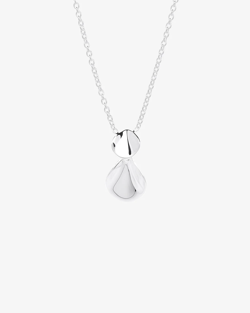 A beautiful silver necklace in polished silver. Feature two pendants, one smaller and one bigger overlapping each other, inspired by flower petals. Elegant and feminine piece of jewellery.