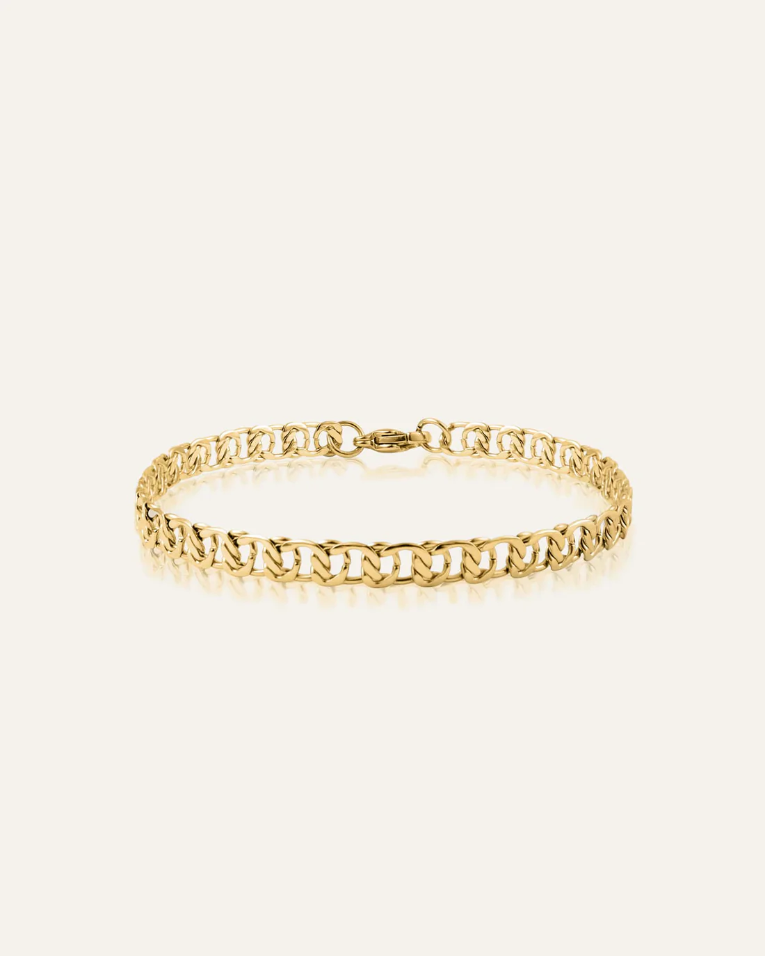 Infinity Bracelet – ett klassiskt armband med en curb chain-design, där de sammanlänkade delarna ligger platt för en stilren och bekväm passform. Kan bäras ensam eller kombineras med en klocka och andra armband. Tillverkat i rostfritt stål med 18K guld PVD-plätering är det både slitstarkt och vattentåligt, vilket gör att det behåller sin färg och glans över tid. Förlängningskedjan kan enkelt tas av för en anpassad passform.