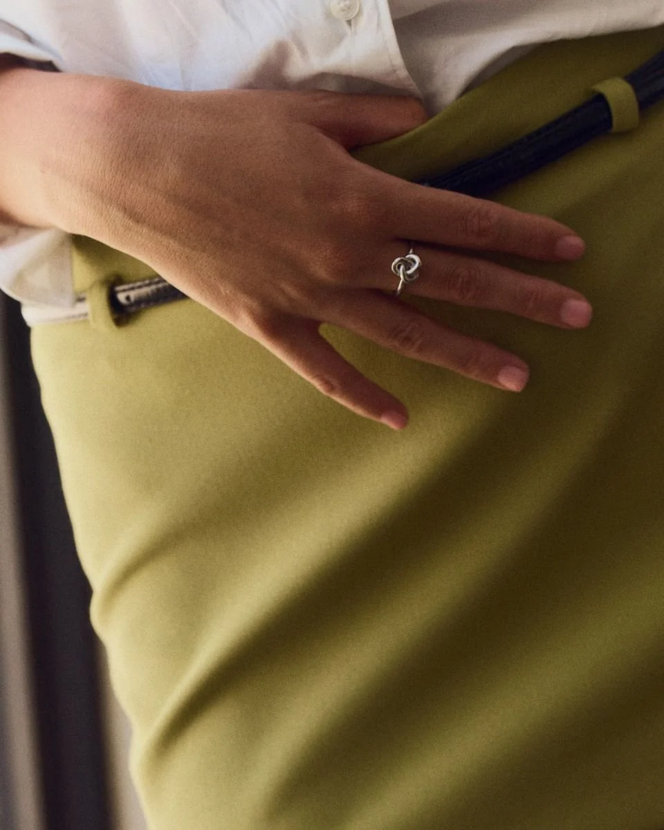 Den skulpturala evighetsknuten i serien Infinity Knot är en tidlös klassiker. De obrutna linjerna i knuten symboliserar kontinuitet. En kraftfull symbol som passar alla tillfällen. Här med knutformen i en nättare ring i blankt rostfritt stål. Fin att kombinera med seriens nättare halsband, armband eller studs.