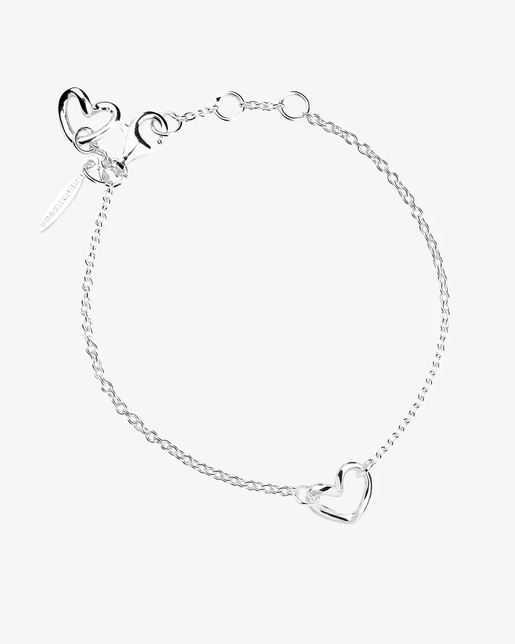 Heart shaped bracelet with a twist design in polished, recycled silver. One heart pendant dangling at the front and another one at the back by the lock. The heart moves freely through the loop, giving the jewelry playfulness movement. The chain is adjustable to make it fit perfectly for your wrist.