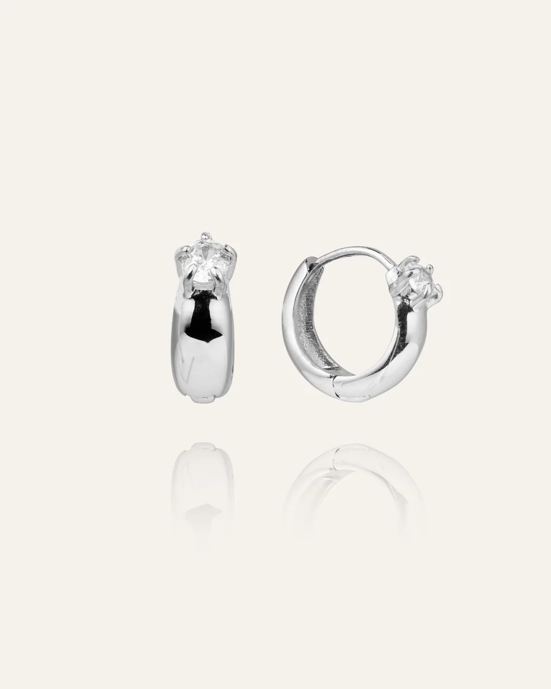Polerat rostfritt stål i perfekt cirkel omfamnar en gnistrande vit cubic zirconia – som solens första strålar i morgondagg. Tack vare vattentålig design följer de med dig genom strandens vågor, sommarregnets lek och vardagsduschens friskhet. Bär din ljusstyrka med självsäkerhet och låt varje dag stråla.